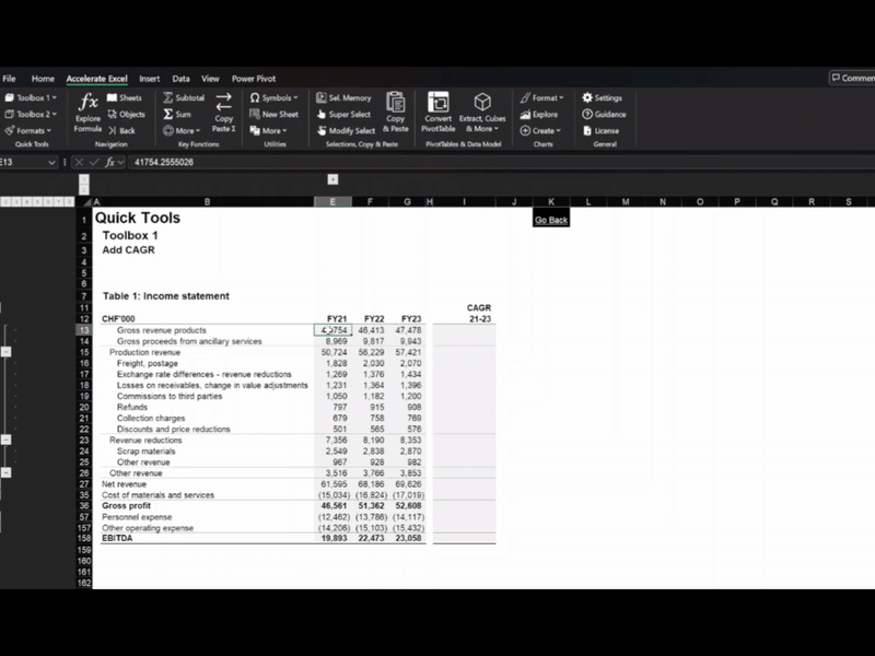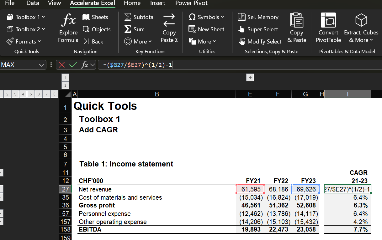 CAGR keyboard shortcut: Select two cells using 'CTRL', hit the ribbon button or Alt > G > 1 > G, enter the number of years, enter a threshold value and the output cell, and the add-in inserts a CAGR function.