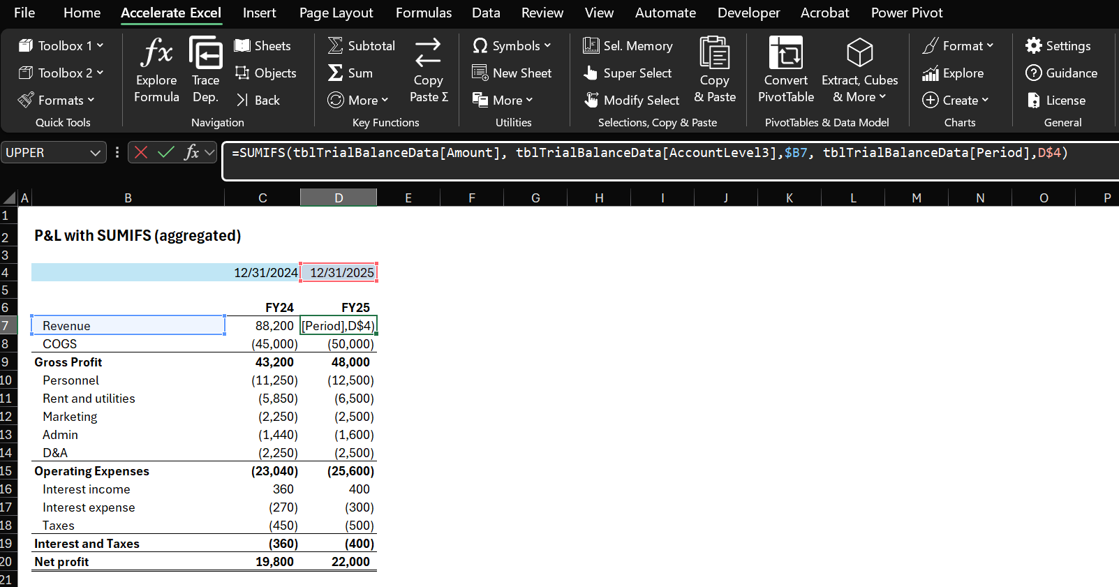 Build a P&L in Excel with both SUMIFS formulas and a PivotTable