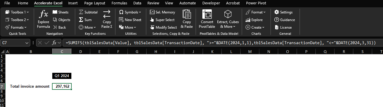 Excel SUMIFS Function: How to aggregate accounting transactions / invoice data between two dates (here Q1 2024).
