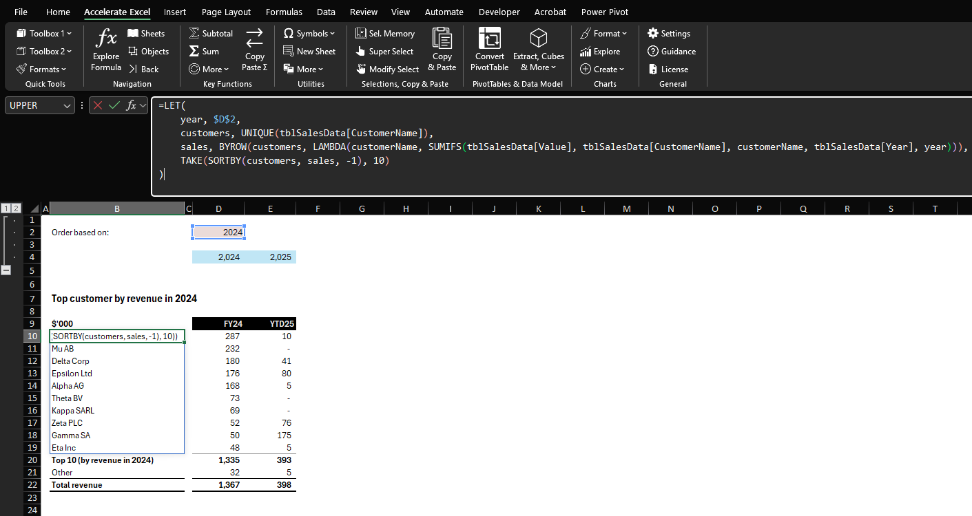 Advanced helper formula to return dynamic and sorted list of top 10 customers.